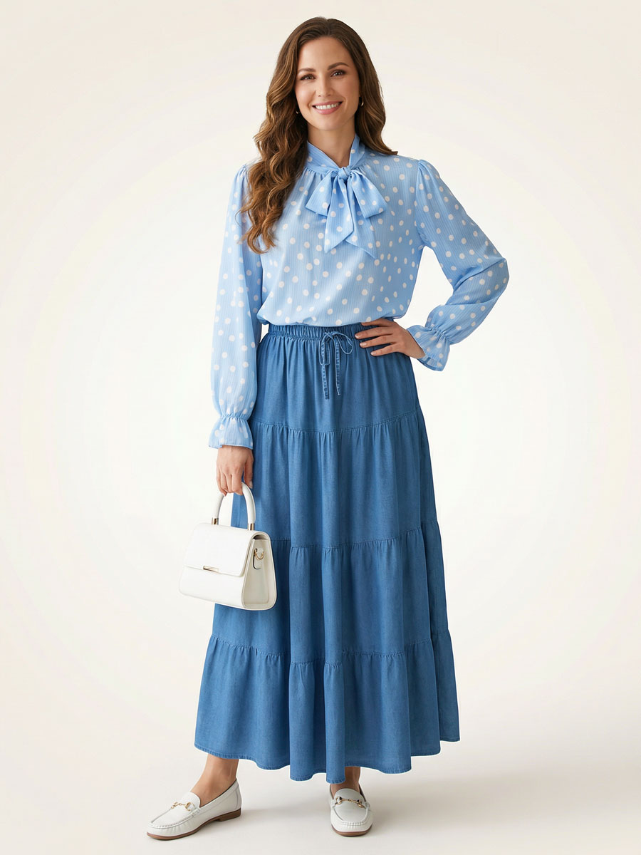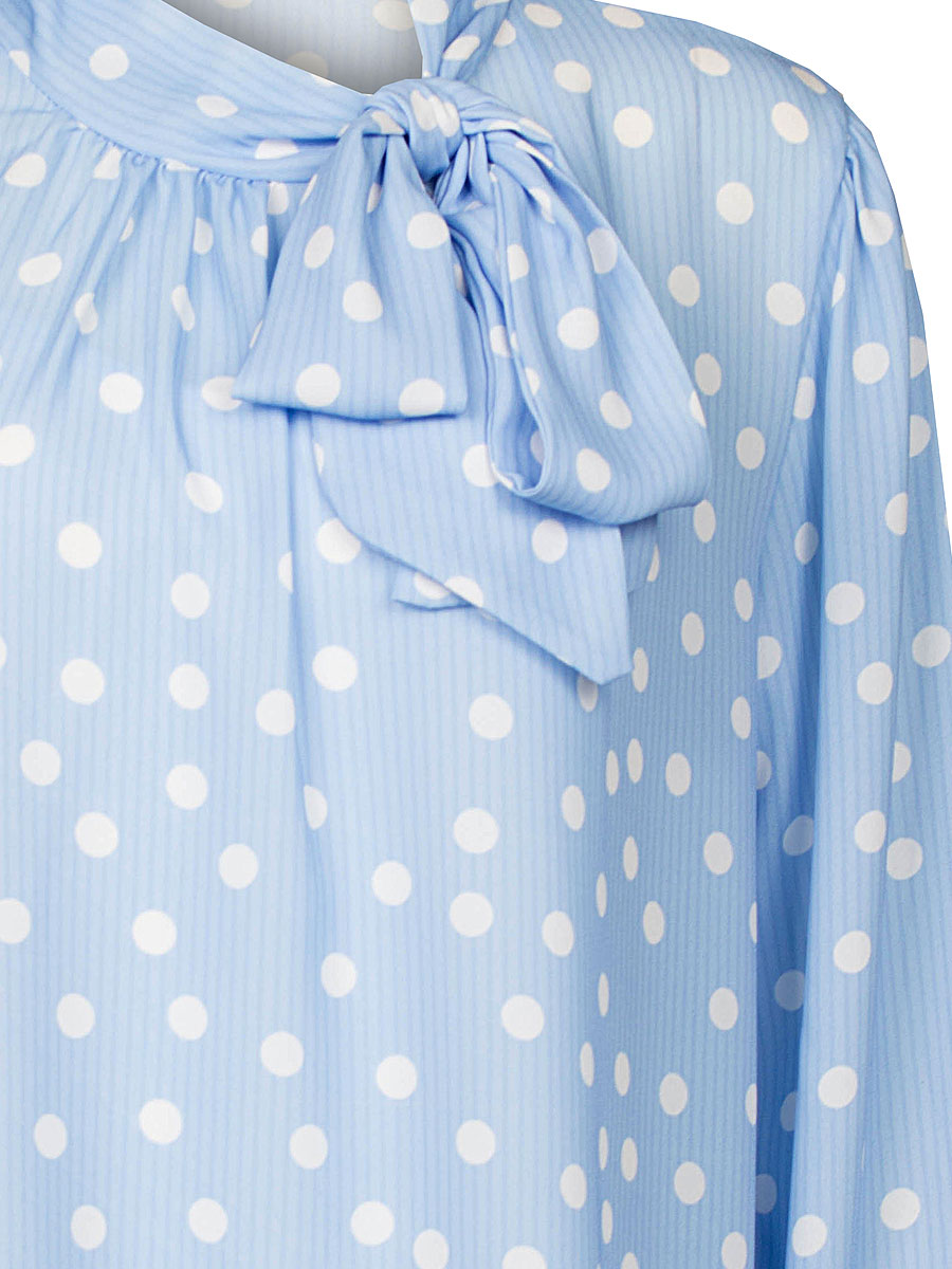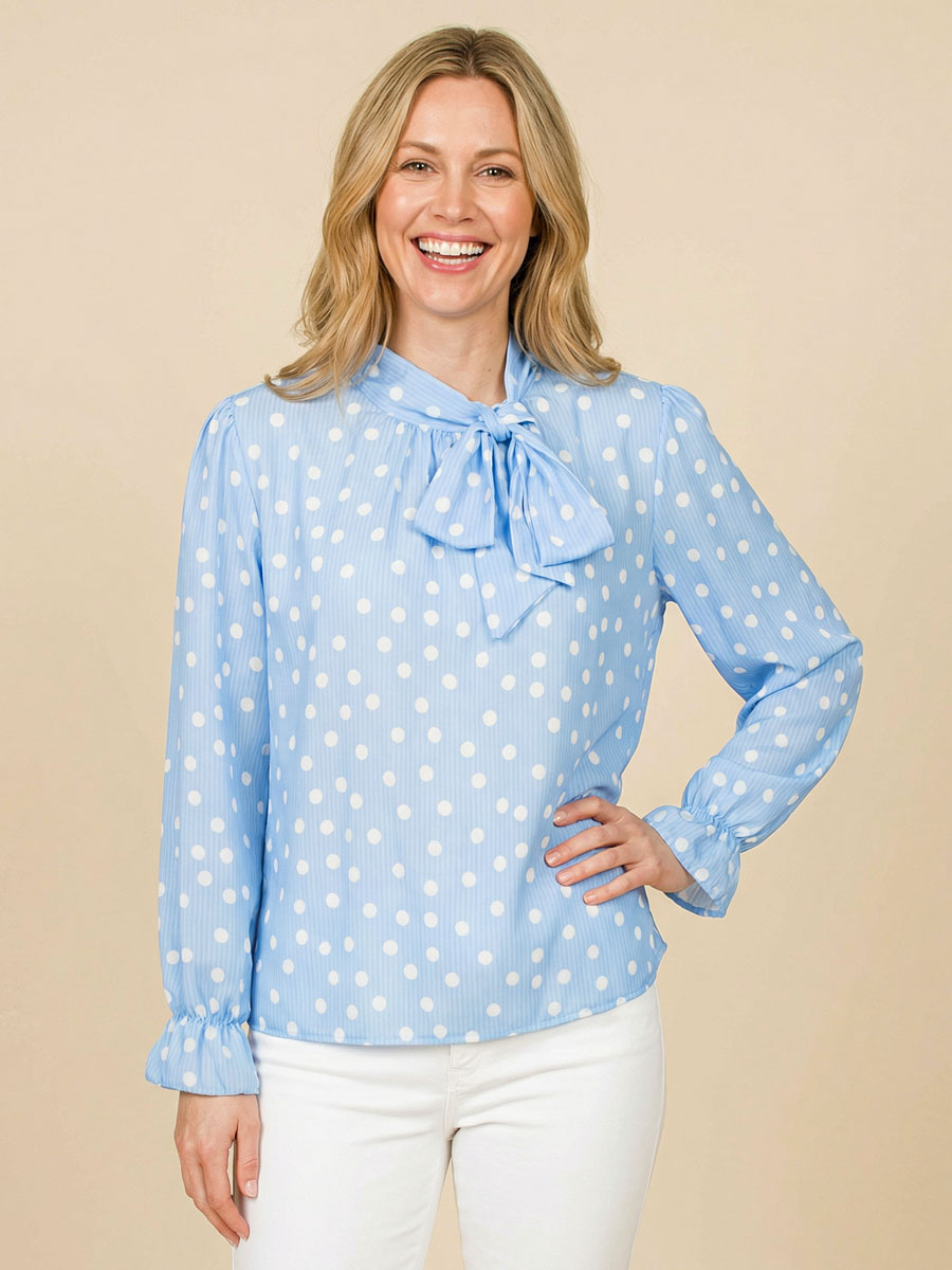 Deze charmante blauwe top is een echte eyecatcher! De combinatie van speelse witte stippen en een heel fijn verticaal streepje geeft de top een subtiele, elegante uitstraling. De strik bij de hals zorgt voor een vrouwelijke en stijlvolle touch – draag ‘m losjes geknoopt of als statement strik voor een extra chique effect. De top heeft lange mouwen met een elastische manchet, wat zorgt voor een mooie, zwierige pasvorm. Dankzij het soepele, luchtige materiaal valt hij heerlijk comfortabel en flatteert hij verschillende lichaamstypes.