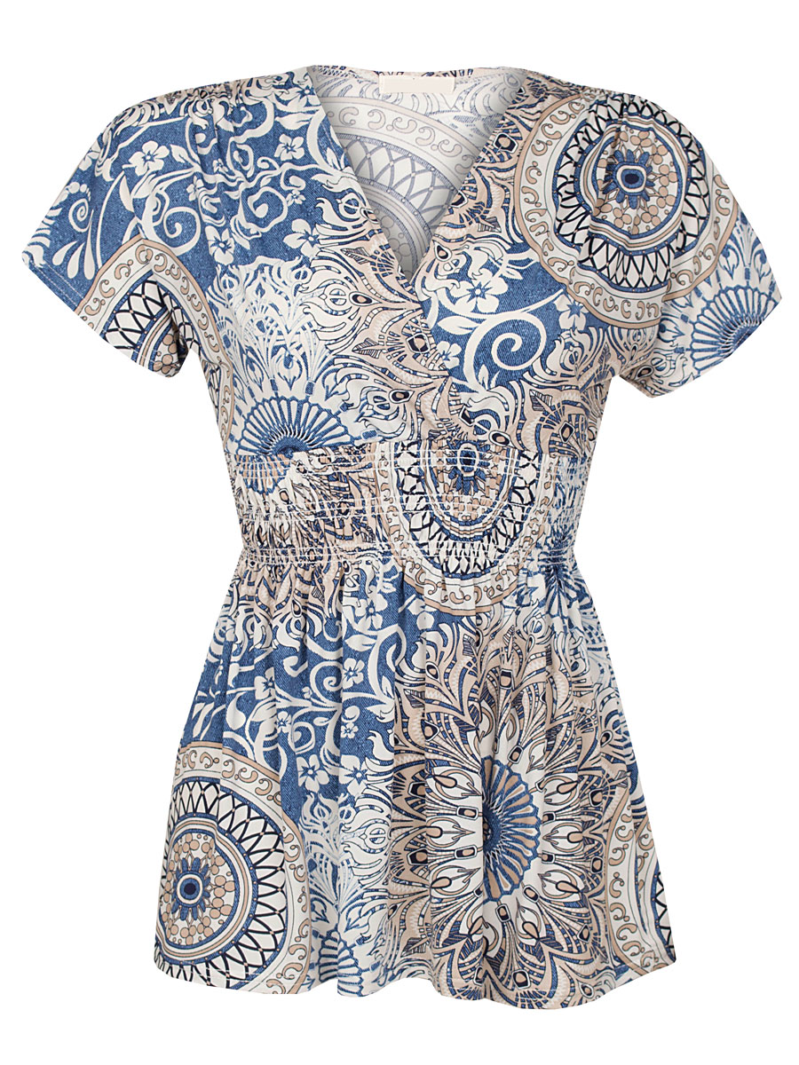 Deze blauwe top met mooie beigekleurige print draagt heerlijk door de stretch. De top met A-lijn heeft een fraaie pasvorm en sluit mooi aan door de brede elastische taille. Deze top is van travelstof en dát is ideaal: heerlijk draagcomfort door de stretch, kreukvrij en na de was snel droog. De top staat erg leuk als set met de blauwe travelbroek die dezelfde print heeft. De printverdeling kan per exemplaar verschillen.