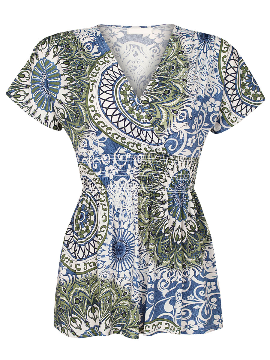 Deze blauwe top met mooie groene print draagt heerlijk door de stretch. De top met A-lijn heeft een fraaie pasvorm en sluit mooi aan door de brede elastische taille. Deze top is van travelstof en dát is ideaal: heerlijk draagcomfort door de stretch, kreukvrij en na de was snel droog. De top staat erg leuk als set met de blauwe travelbroek die dezelfde print heeft. De printverdeling kan per exemplaar verschillen.