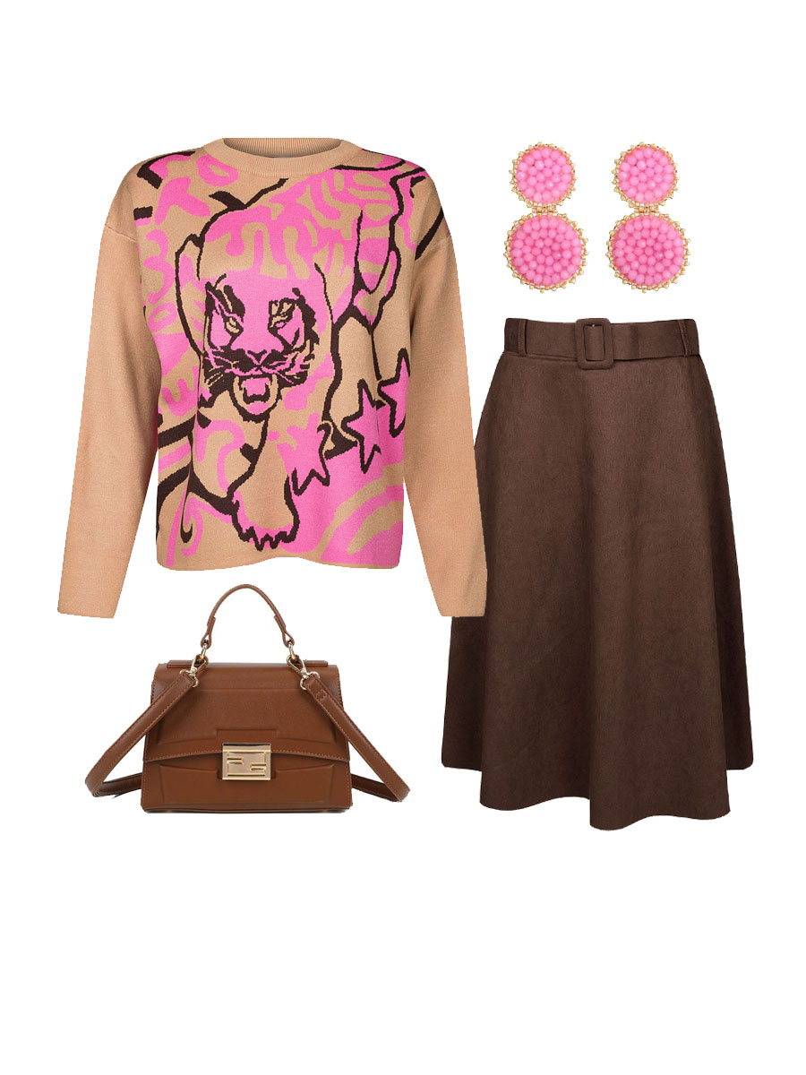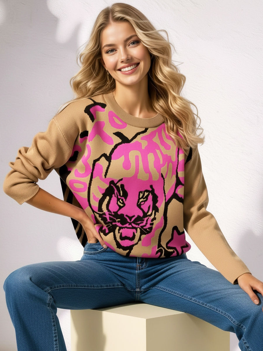 Deze fijngebreide trui met gebreid pantermotief is een echt statement piece. De bruine basis wordt speels gecombineerd met roze accenten, waardoor de trui een vrolijke en modieuze uitstraling krijgt. Het mix-&-match dessin met de panter en abstracte vormen zorgt voor een unieke look. De trui heeft een ronde hals, lange mouwen en een comfortabel breisel dat prettig aanvoelt. Dankzij de fijne pasvorm is hij makkelijk te dragen en ideaal voor zowel casual als meer geklede outfits. Combineer met een jeans voor een trendy everyday look of met een rok voor een speels-chique uitstraling.