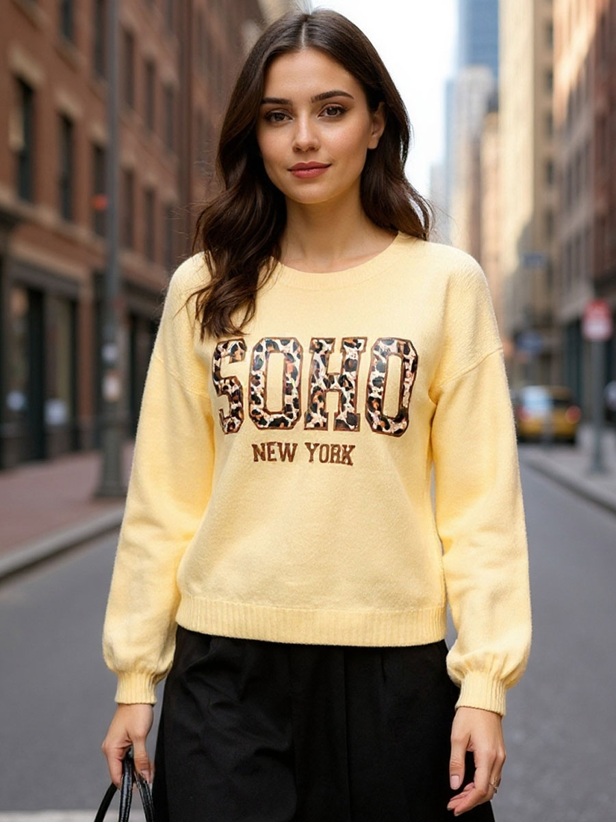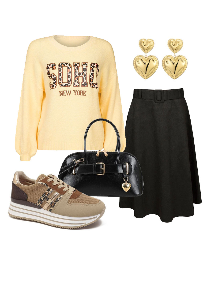 Voeg een vleugje New Yorkse flair toe aan je kledingkast met deze heerlijk zachte fijngebreide gele trui. De gele kleur vormt de perfecte basis voor de opvallende SOHO New York opdruk op de borst. De letters zijn ingevuld met een stijlvolle luipaardprint, wat zorgt voor een eigentijdse en speelse look. Deze trui heeft een comfortabele pasvorm die mooi aansluit op het lichaam zonder strak te zitten. De mouwen zijn afgewerkt met een verfijnd boord voor een nette uitstraling. Of je nu kiest voor een sportieve look met een sneaker of een geklede outfit, deze trui is een veelzijdige toevoeging aan je collectie.