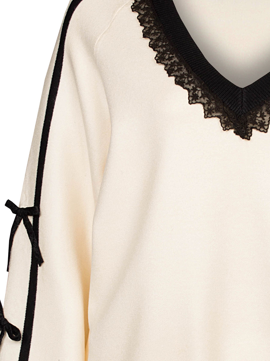 Deze stijlvolle crèmekleurige trui combineert comfort met verfijnde details. De elegante V-hals is afgewerkt met zwart kant, wat zorgt voor een vrouwelijke en luxe uitstraling. Langs de mouwen lopen contrasterende zwarte biezen, afgewerkt met speelse strikjes voor een subtiel chic accent. De trui heeft een losvallende pasvorm en zachte knitkwaliteit, waardoor hij heerlijk draagt en mooi valt. Perfect te combineren met een jeans voor een casual look of met een rok of pantalon voor een meer geklede outfit.